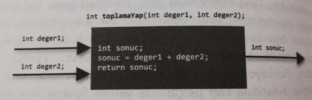 Fonksiyon Parametreleri: Bu alanda fonksiyonun yapacağı işlem için gereken parametreler belirlenir. Yani örneğimizde int deger1, int deger2 olarak tanımladığımız tam sayı değerleri, bu fonksiyonun parametreleridir.